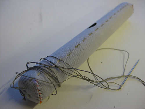Enhebrar una aguja con hilo normal y comenzar a coser el neopreno juntos. en primer lugar a lo largo de la longitud y luego ambos extremos. puede insertar las pilas mientras se cose para que sea más fácil. Y usted puede cortar el agujero al final quitar las pilas. Asegúrese de que el agujero no es demasiado grande. neopreno es muy resistente y puede tomar un montón de estiramiento.