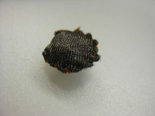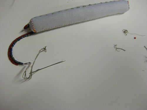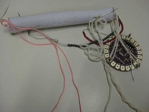 Cuando tengas ambos extremos + y - en el mismo extremo de la bolsa. usted querrá llegar a LilyPad Arduino. aislar las roscas con vidrio o cuentas de plástico y coser alrededor de las conexiones de lilypad y pegamento antes de cortar.
