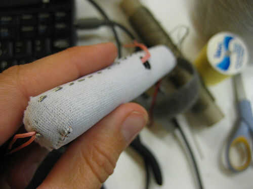 Enhebrar una aguja con hilo conductor. sumergirse en el neopreno en los extremos de la bolsa de la batería y hacer contacto con el tejido conductor dentro. Utilice un multímetro para asegurarse de que tienes las conexiones. y varias veces para asegurarse de que la conexión es buena. Usted puede definir - y + cambiando simplemente la dirección de todas las pilas. uno de los extremos se deja directamente en su extremo de la bolsa de la batería, el otro tendrá que ser derribados con el mismo fin por costura a lo largo por el neopreno. Tenga mucho cuidado que el hilo nunca pasa completamente a través del neopreno, donde podría hacer contacto con una de las baterías o la forma de la tela conductora el otro extremo. Utilice un multímetro para probar como coser.