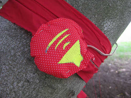 Dibujó un poco diseño rápido de un altavoz en el software de ilustrador vector de la máquina de coser y 2 agujas y un montón de hilos más adelante, tenía un buen emblema. Esto fue cosido en forma de pequeña almohadilla, con el altavoz en el interior, detrás del relleno. El relleno ayudaron para atenuar algunos de la crudeza en el sonido y hacerlo más silencioso.