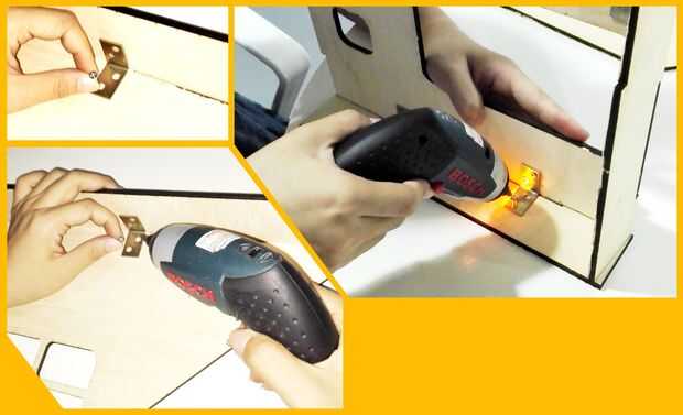 A la madera superior y la madera contrachapada de cara lateral junto con tornillo y ángulo de hierro.