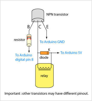 Los límites de resistencia de 1000 ohmios la corriente en la Base del transistor, el diodo en la bobina del relé es necesaria preservar el transistor de puntas de tensión grandes inverso generado por el relé cuando se abre. El diodo tiene una polaridad, buscar el anillo negro en su cátodo.