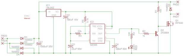 1N4002 diodo (D5) detrás del tambor de frenaje EMF (sin este diodo la retroalimentación de las bobinas de bell puede dañar Q1)