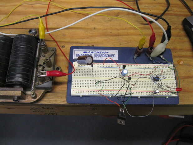 resistencia de 1 k Ohm, transistor de NPN 2N3904 y resistor del ohmio de 10 k como un traductor de tensión para tomar la salida 5V del temporizador y elevarlo hasta el nivel de voltaje de entrada no regulada.