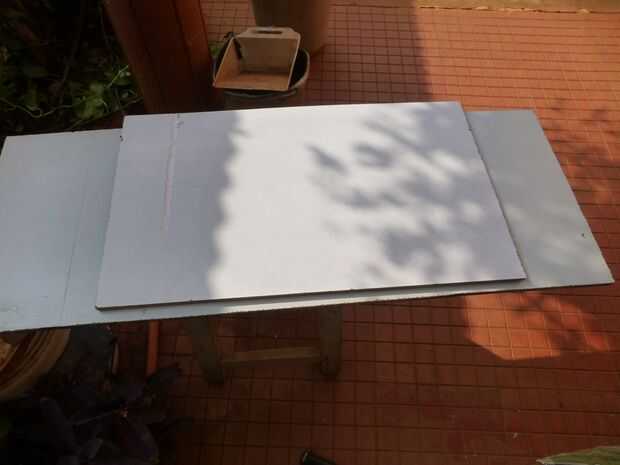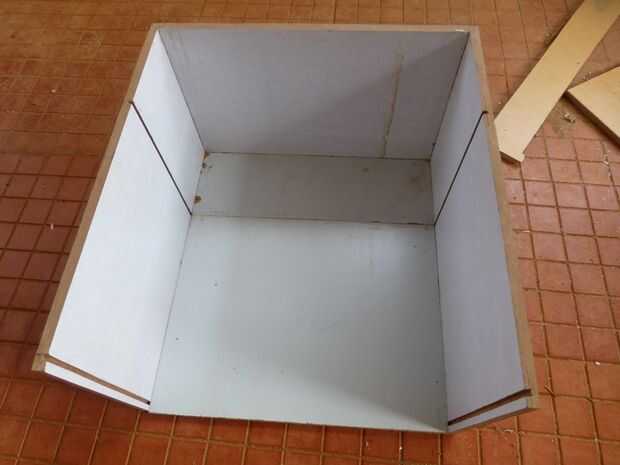 - Medir la parte interior inferior de esta Asamblea. Este será el tamaño del tablero inferior. El tamaño mide 44 centímetros por 39 centímetros
