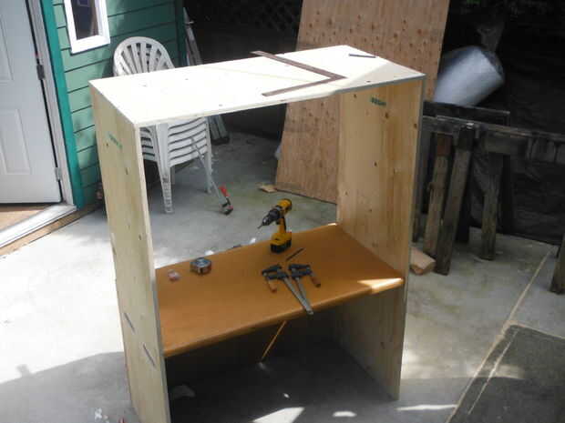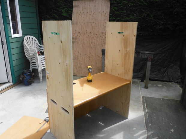 Tienes que empezar con una superficie plana. Usé el patio y una hoja de madera contrachapada con unas cuñas. Comience con las dos piezas más que eventualmente las paredes verticales. Tómese su tiempo aquí para que sean cuadrados a la superficie del escritorio. Use tornillos para madera (3 – 4) con acabado arandelas por cada lado. Ahora debería verse como un poste. Luego rematar con ese 2 'x 2' pieza más corta y otra ronda de tornillos y arandelas.