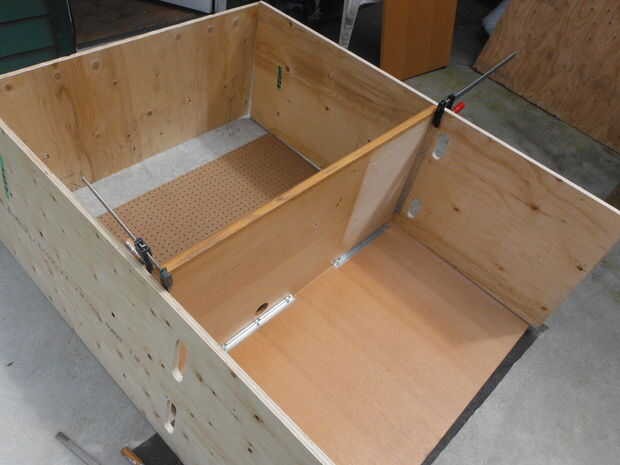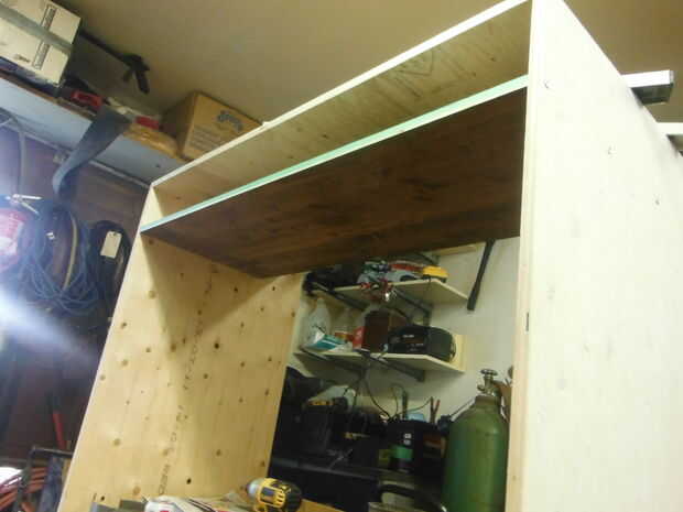Para formar la caja que albergará el extractor, empieza por tomar el pino que era antes. Monte el pino al ras con la parte delantera de la campana de humos para formar un 6" de alto 17" profundo estante. Esto haría que un gran lugar para el cable / satélite consola caja, ordenador o favorito! Luego, añada el tablero de clavija en el fondo y la madera contrachapada de ¼" para separar la plataforma del extractor. Utilice abrazaderas o tornillos para fijarlos en las paredes laterales.