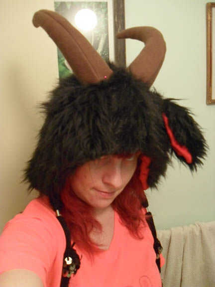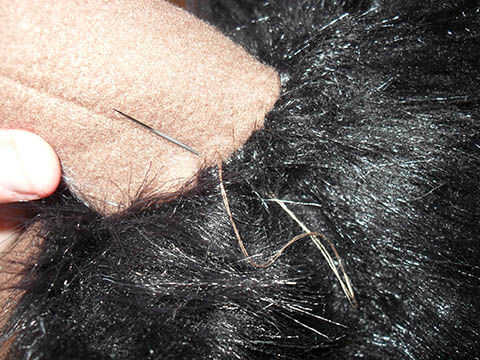 Seguro con la costura de la mano, teniendo cuidado de tomar la capa de piel sintética y forro polar sin meter por medio a su capa de revestimiento. Sólo doblar para arriba en su pisada para esta parte. Tire sus puntadas ajustado por lo que ayudan a soportar los cuernos y cerradura derecha que desee.