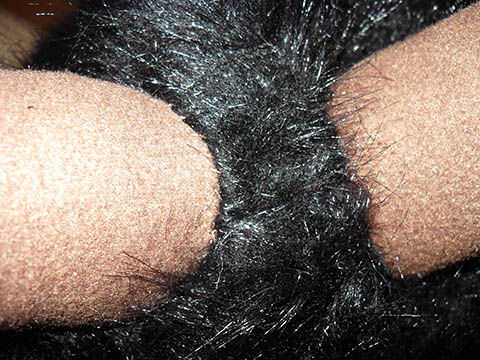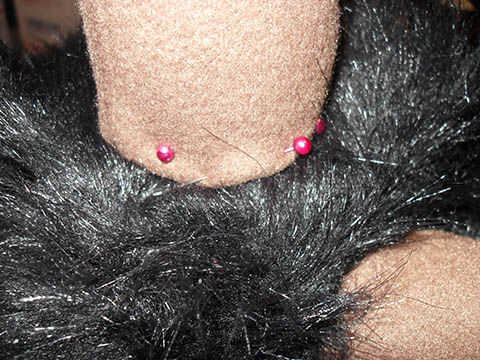 Los cuernos a la campana del perno. Mina colocada justo detrás de la media de cierre de la parte superior de la cabeza. Esto probablemente tomará 3-4 pines, y puede muy bien meter a ti mismo en este punto porque es difícil ver pin consejos en piel negra.