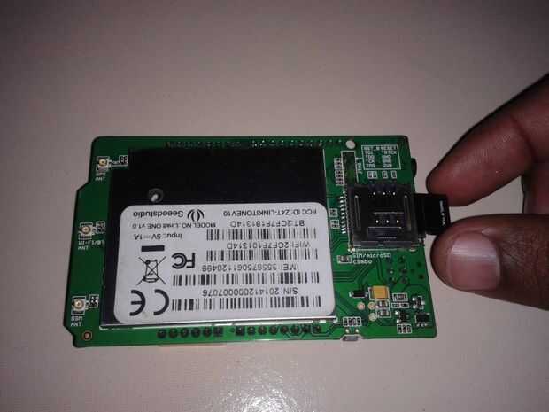 2) Inserte la tarjeta de memoria en la ranura para tarjetas Micro SD en la parte posterior de la un junta linkit.