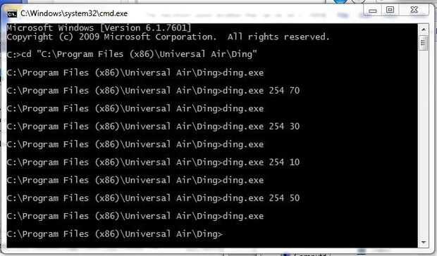Establecerá prosencéfalo para conducir el solenoide con un pulso de 50ms. Asimismo, ding.exe 254 10 utiliza un pulso de 10 ms, y ding.exe 99 254 utilizará un pulso 99ms. La duración del pulso máximo que se puede establecer es de 100ms para evitar el dibujo demasiado corriente del puerto USB. Una vez que se establece la duración del pulso, se almacena en Forebrain EEPROM, por lo que será recordado hasta que lo cambie.
