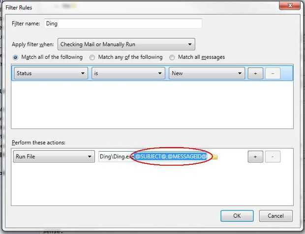 4. establecer el realizar acciones "Ejecutar archivo" (hecho disponible por la extensión de la FiltaQuilla) y el archivo a la aplicación de ding.exe.