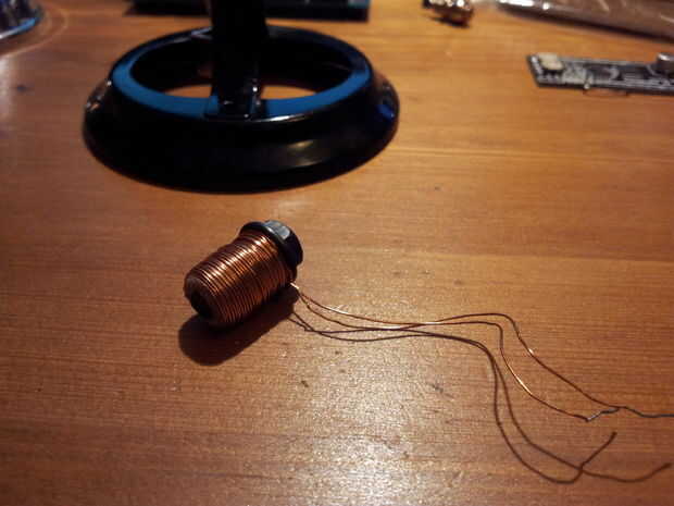 Usé un perno de acero repuesto encontré en alguna parte (pensamiento transpiró que el perno no fue repuesto y era de hecho el perno que falta de mi silla), y envuelto sobre un metro y medio a dos metros de alambre de cobre esmaltado sobre él, usando cinta de doble cara entre las capas para asegurarse de que no se salgan mientras fui de la bobina el cobre.