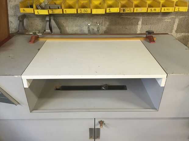 Yo uso un viejo gabinete de la impresora como una tabla de diseño de trabajo de la madera. Tiene un bolsillo en donde la impresora solía sentarse. Esto hará un lugar perfecto para la mesa de tiro descendente. Por la vuestra, considerar solamente construir una caja utilizando la misma técnica.