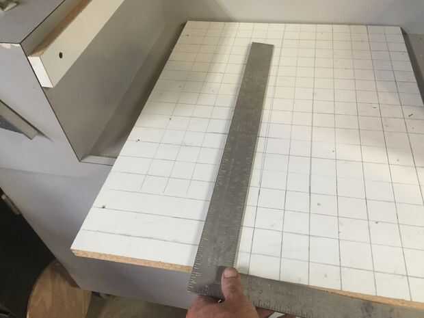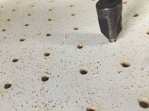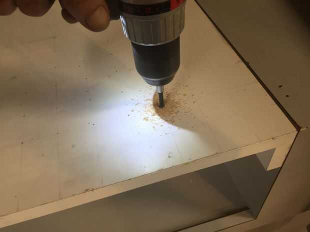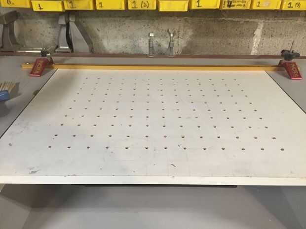 Comience con el MDF. Coloque una cuadrícula en él y perforarlo. Esta tiene una cuadrícula de 10 x 13 para 130 ¼" agujeros. Es una buena idea de Avellane los agujeros.