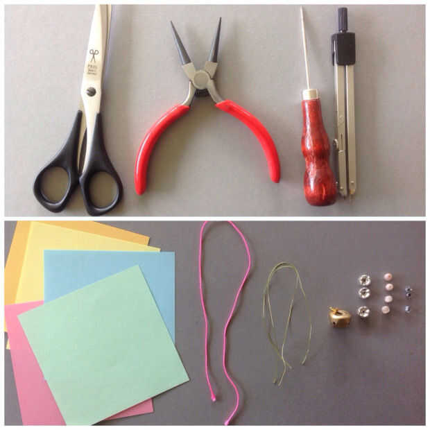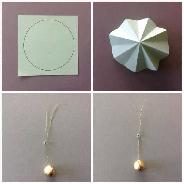 Marcar el papel con un círculo y recorta y dobla transversalmente. Prepare un trozo largo de 20 cm de alambre como en la imagen con la campana. La perla es un tapón que se coloca debajo del papel.