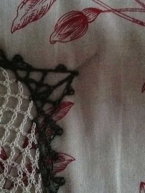 CH 6 sc 3 ch de gancho (hace un picot) ch 2, sc en el siguiente bucle. Repetir hasta llegar al primer motivo. Del bucle anterior, ch 2, dc en el dc, ch 3, trc en trc, ch 2, dc en el dc, ch 3 sc en el siguiente bucle. CH 6, sc en ch 3 de gancho (picot) ch 2sc en bucle siguiente. Repetir hasta llegar al siguiente motivo.
