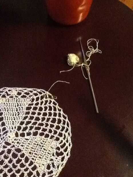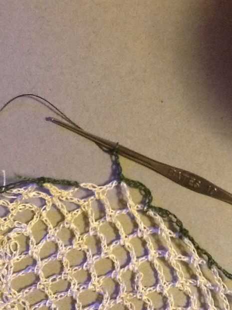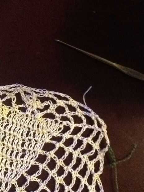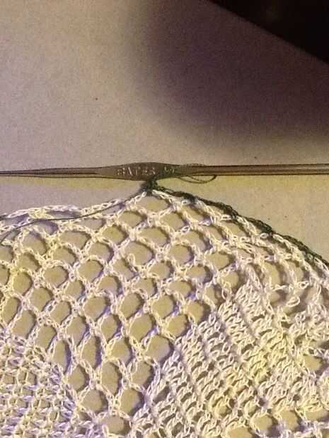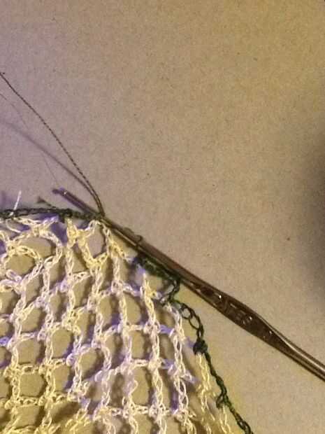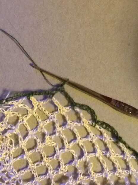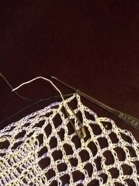 Corte hilo color principal y la armadura final a través de lazos de cadena. Conectar nuevo color haciendo (no alrededor) un sc en el centro del lazo antes del bucle donde se anuda el color principal.