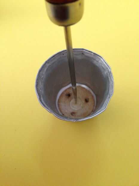 Para hacer un agujero en la parte inferior de la cápsula, colocar la vaina plana en una tabla de cortar (o simplemente un pedazo de tarjeta de scrap o madera) y pasar con cuidado la lezna en el centro. El metal es muy fino y no toma mucha presión.