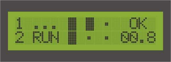 Después de la energía en/reset, cada una muestra muestra 00.0. Después de presionar cualquier botón start/stop, una barra se enciende en el centro del carácter más a la derecha de la pantalla para mostrar que la medición va (así como "Ejecución" se mostrará en la pantalla LCD). Tan pronto como el temporizador se ha parado (con pulsar el botón start/stop deseada), la barra desaparecerá y el tiempo medido se muestra inmediatamente con 1/10 segundo exactitud. Este valor será sin cambios hasta que finalice la próxima medición del cronómetro.