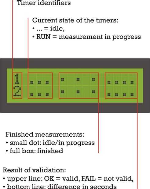 Cada LED pantallas se utiliza para mostrar el tiempo medido para dos cronómetros independientes. El tiempo medido en el cronómetro primera puede verse a la izquierda, el tiempo medido en el cronómetro segundo puede verse en la pantalla derecha. Es importante hacer notar no hay corriente tiempo vista durante la medición. Se indica el estado real del cronómetro (corriente o inactivo) en LED muestra con una barra en el caracter más a la derecha de cada pantalla.