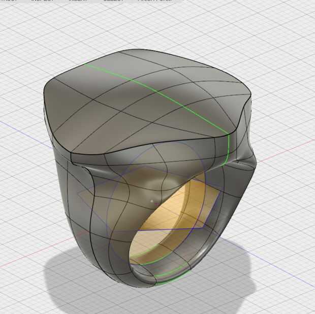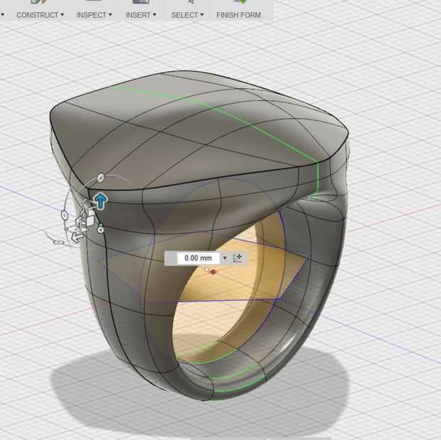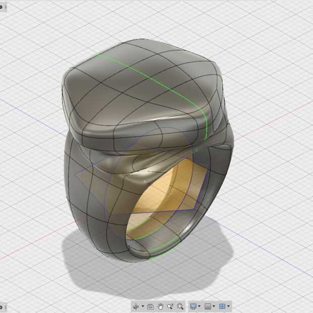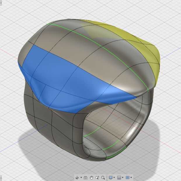 Ahora que llegué a un anillo en forma más o menos pentagonal, es tiempo para refinar la forma. Esto es donde tenía la paciencia de la mayoría. Este paso puede tomar un tiempo, es frustrante y puede o no puede llevar a tirar del pelo. Por suerte, este proceso fue bastante eficiente al utilizar 360. La libertad que el modelado de SIDA como T-splines con simetría (azul/amarillo) permite para poder moverse libre y rápidamente es ideal para el proceso de conformación. También me encanta tener la posibilidad de guardar muchas versiones de cada paso de mi proceso en la nube en caso de que no me gusta la dirección del diseño me voy y quiero volver a los modelos anteriores. (Como puede ver, esto sucede mucho)