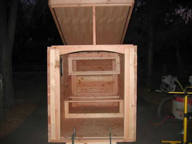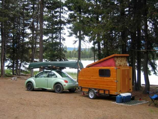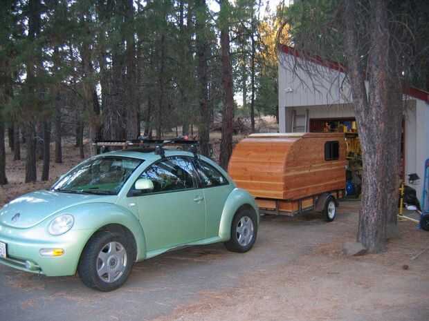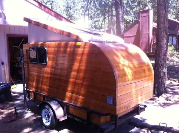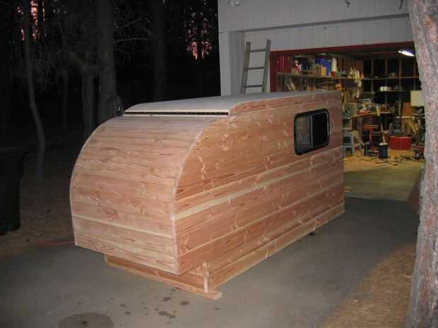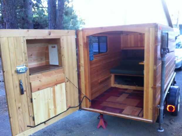 Cabina de Kleine, holandés para cabina poco. Que busca en un uno-de-un-tipo camper de abeto de Douglas, top pop con toda la madera sólida. Características son: cable de 50 ft RV, 2-6 voltios baterías de golf carrito panel solar de 50 vatios, espacio del gabinete superior con almacenamiento debajo de la cama, pequeña cocina en la puerta trasera con dos puertas de gabinete, encimera y cajones. Hay un pequeño inversor de 300 vatios para darle AC para computadoras, luces, música y carga del teléfono. Longitud es de 10 pies, ancho es 4 ft altura es 4,5 ft. Pesa cerca de 1200 libras y fue recubierta Watson fuera de la puerta final del aceite. Puesto que no sabía acerca de
