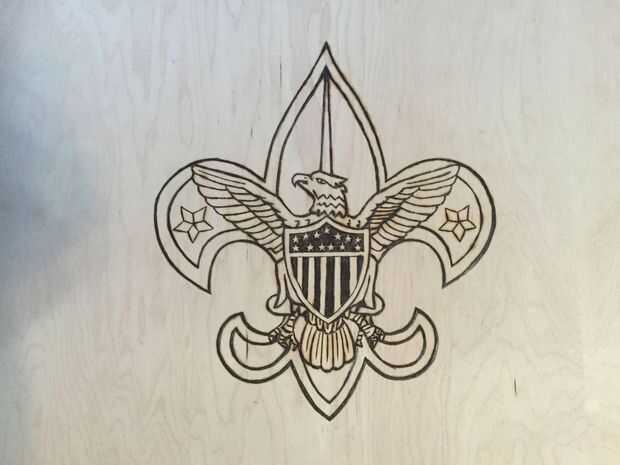 Estoy utilizando caballetes para las piernas, por dos razones. 1 estabilidad del agregado y 2. Menos peso. Decidí quemar madera un logotipo de Boy Scout en el panel frontal.