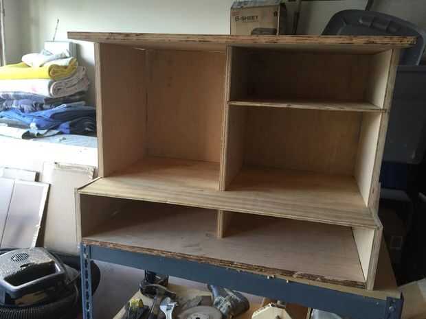 Este paso necesita medir y volver a medirle los artículos. Poner y salir así. Hice una pieza media y una repisa que va en él y luego un estante alto. Todas están equipadas junto a la pieza media con routered ranura cortada en la espalda y los lados... Quería más fuerte las esquinas y lados así que corte mis estanterías para que no cortan en las esquinas de la parte posterior y lados. Todavía no pegar estas juntos todavía, pero sujetarlos hasta control fit. También cortar la parte superior y colocado en a ver cómo se ve. También tendrá que asegurarse de que los gabinetes no golpeó nada dentro y tienen mucho espacio para hacer pivotar. Una vez que todo el interior lo quiere, le corté la parte superior. Es lo mismo que la parte inferior, pero la medida sólo para asegurarse. Y recuerde que debe colgar sobre el recorte para los gabinetes.
