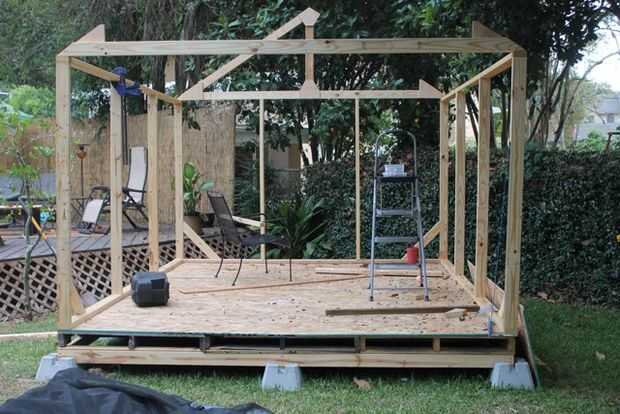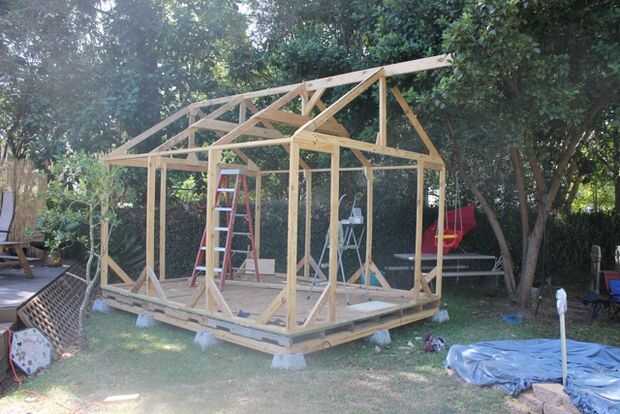 Hemos construido un cobertizo. Lo llamamos nuestro galpón. En lugar de sólo un edificio de almacenamiento de metal débil, decidimos construir algo duradero y agradable en nuestro patio trasero para guardar bicicletas y herramientas. El costo de kit d