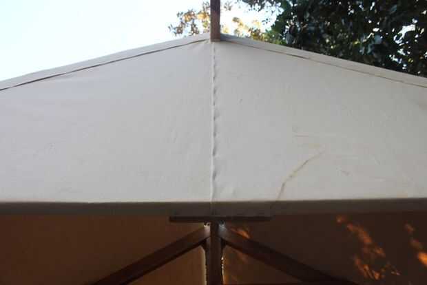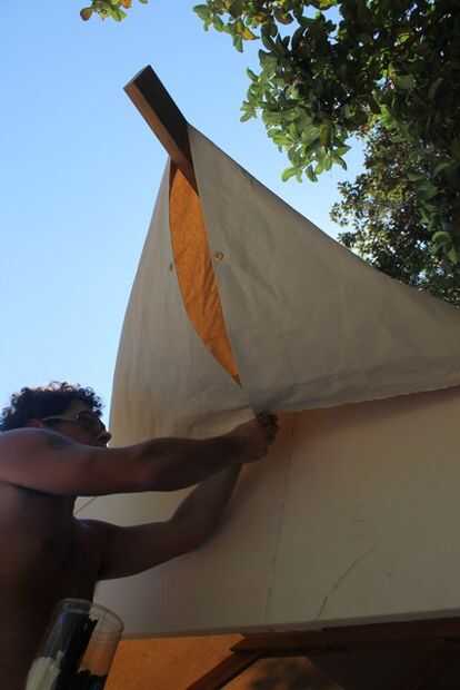 Ahora esto es donde el periquito tuvo poco éxito! $2 300 por 75 pies x 5 pies tratados tela de la lona de Mytarp.com, 3/8 pulg y arandelas de 1/2 pulgada, y no sé cuantas grapas de trabajo pesado 1/2 pulgadas. El lienzo en la parte inferior del rodillo la mitad de una sola pieza continua y básico como ir. Parece cortado a picos delanteros y traseros con agradable limpio apretado. Se superponen ambos lados del techo se superponen los adelantos y los lados. Una pieza superior para cubrir el resto de las lagunas. Ojales en las aletas delanteras para fácil de abrir. Y sí...! .. .it es totalmente impermeable. Vino pretratado.