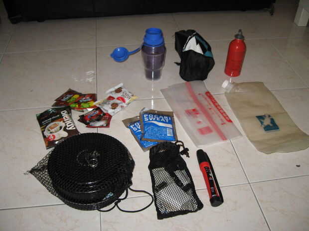 Alimentos y agua son obviamente necesarias. Alimentos es una cosa personal que tomar muchas comidas secas instantáneas del mercado con cosas frescas que mantendrán.