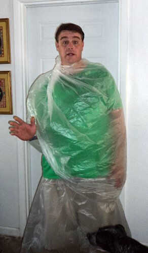 -Hágale un agujero en la parte inferior de la bolsa 2 y ponga su cabeza a través de él.