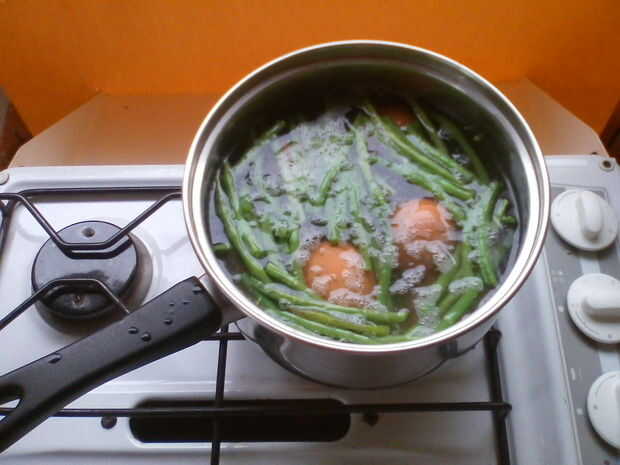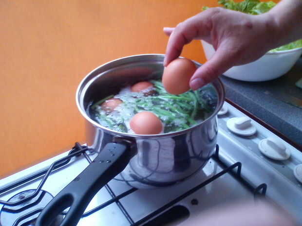 Finalmente cuando el agua comience a hervir cuidadosamente puede colocar un huevo por persona en la sartén. Si los huevos están sucios o no está satisfecho simplemente dejando caer los huevos en entonces Dales una limpieza bajo un grifo previamente.