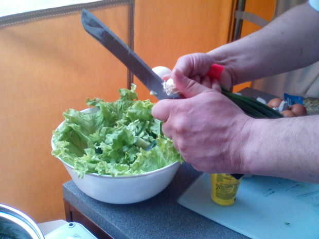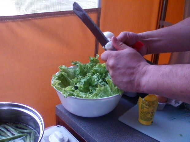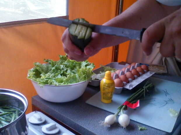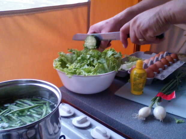 Luego añadir pepino picado y cebolla en rodajas antes de incluir las patatas cocidas y judías.