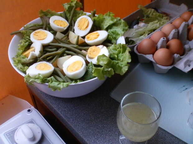 Tomar las cáscaras de los huevos, cortar por la mitad y colocar en la parte superior todo lo demás.