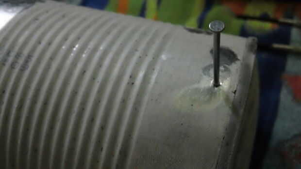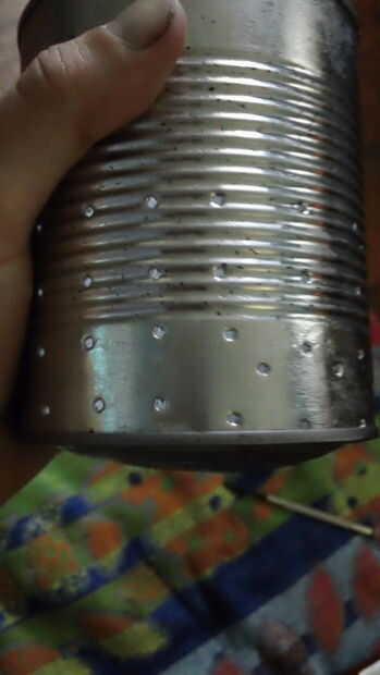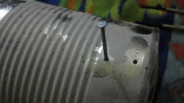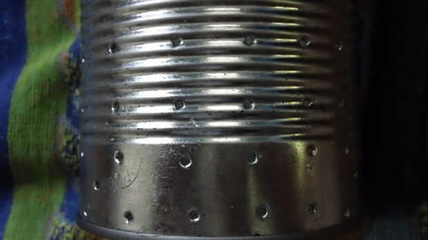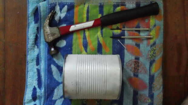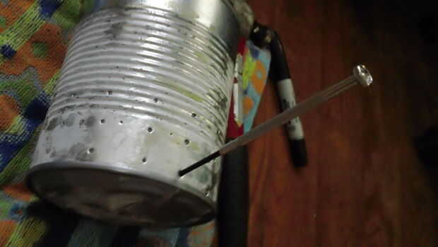 Segundo, agarra un martillo y clavo (o destornillador) y utilizarlas como un martillo y cincel para perforar los agujeros de ventilación en la parte inferior la mitad de la lata. La idea es que permita que el oxígeno en la parte inferior de la estufa para ayudar a alimentar las llamas. Perfore los agujeros en cualquier patrón que desee.