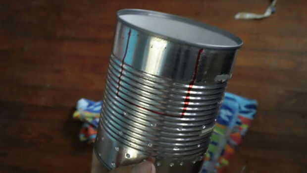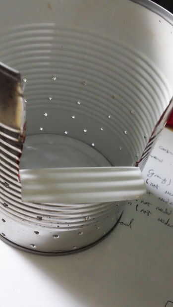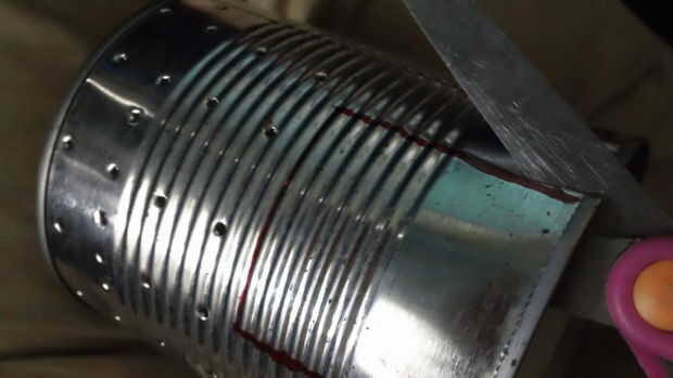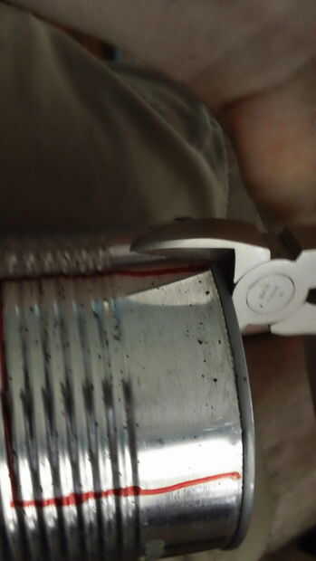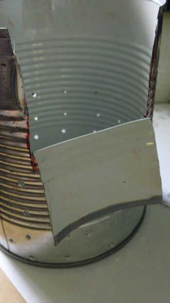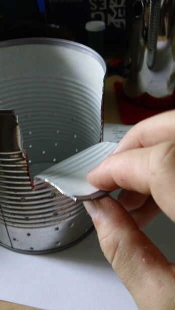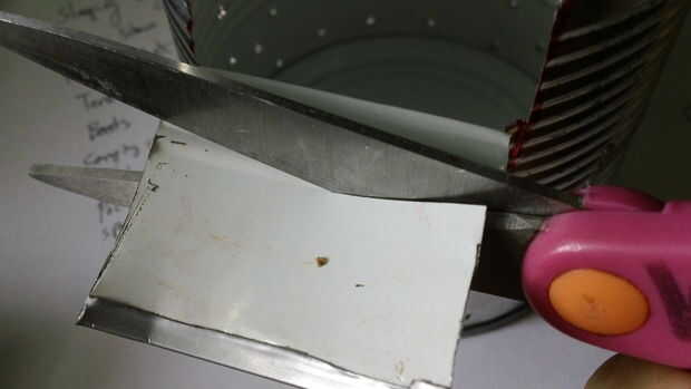 Por último, doblar la aleta hacia abajo, hacia el exterior de la can y recortar todo pero más o menos 1" o lo de la aleta. (haga esto en ambos lados de la lata)