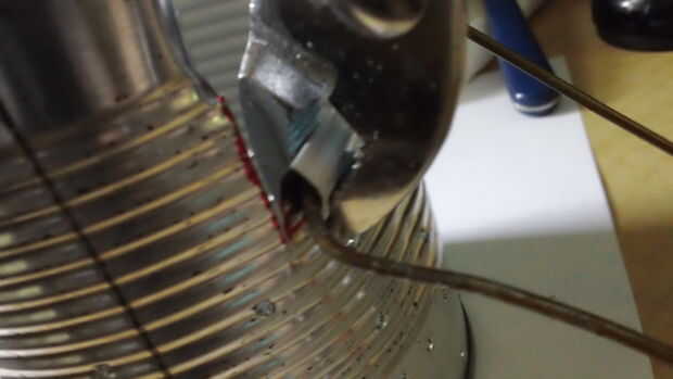 Segundo, tomar sus alicates de punta planos y doblar la solapa hacia abajo y alrededor de la manija. Idealmente debería ser capaz de mover la mano hacia arriba y hacia abajo sin que deslizarse hacia fuera. Si se desliza hacia fuera simplemente pop nuevo y volver a doblar hasta que se queda puesto.