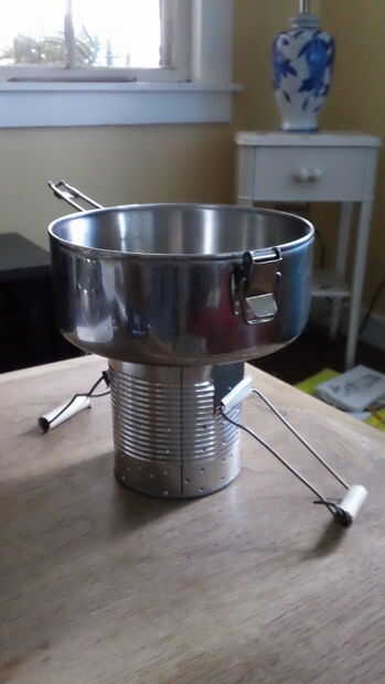 esto es una lata de sopa que convirtió en una estufa con combustible sterno conocido gel. Calentará sopa, té, ravioles, chocolate caliente y muchos de esos otros productos enlatados/líquido. Se puede usar interior y exterior con seguridad. Este es mi