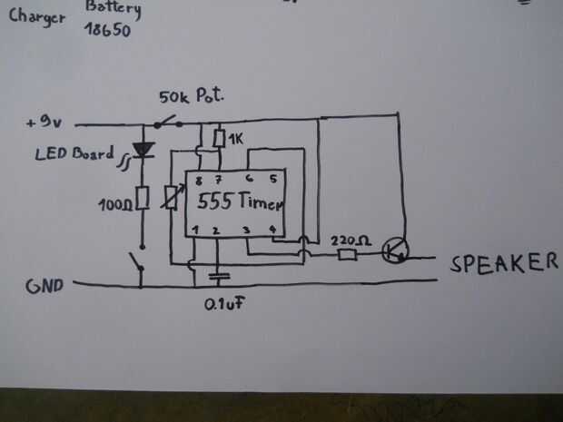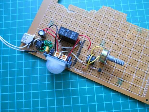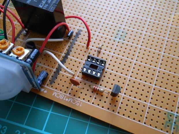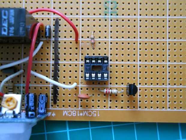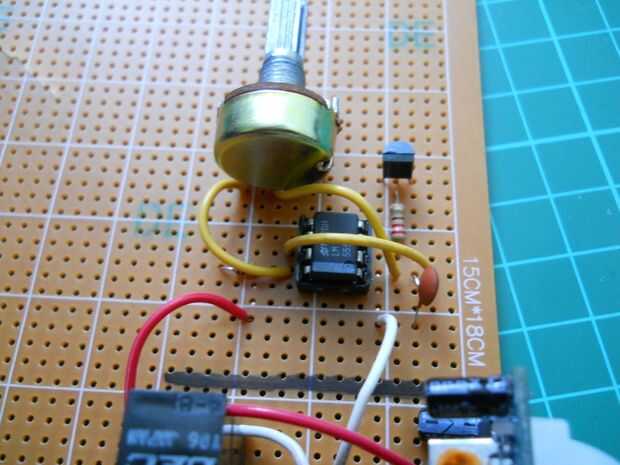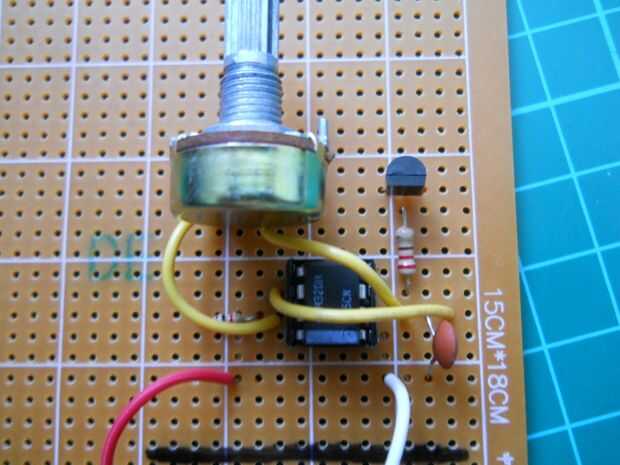En primer lugar solde el cable positivo desde el relé y el cable de tierra a esta parte de la placa de circuito. Luego añadir las partes. El potenciómetro puede utilizarse para cambiar la frecuencia de salida.