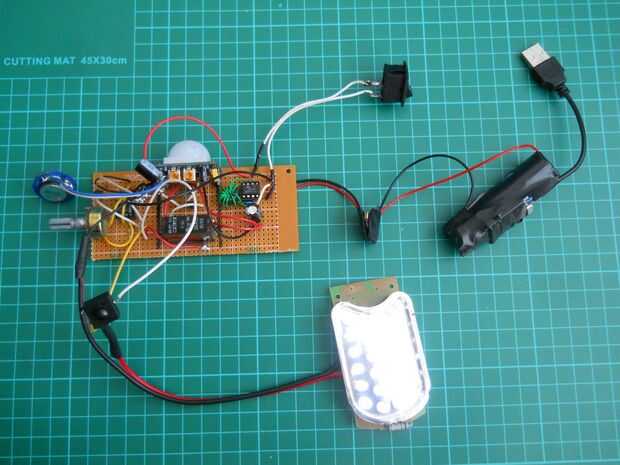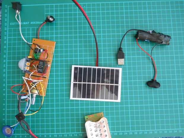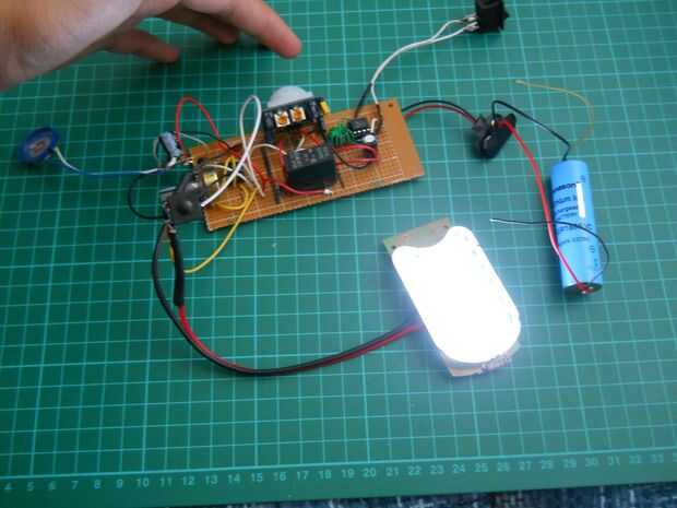 El circuito tiene que parecen de alguna manera en los cuadros o un poco mejor. Funciona sin problemas, la gama máxima del sensor se encuentra a 9 metros, y la hora de alarma se establece en 40 segundos.