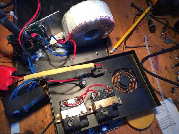 Me llevó todo el circuito y había instalado en la caja. Tuve que hacer un pequeño tablero de PC para el indicador de LEDs, pero aparte de eso seguí simple. Recibe 12v de las baterías e invierte a 220v que está disponible cuando está activada.