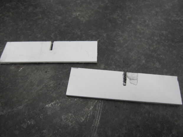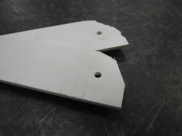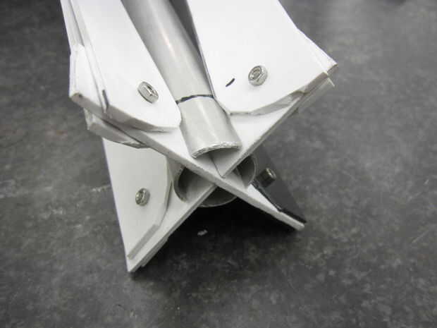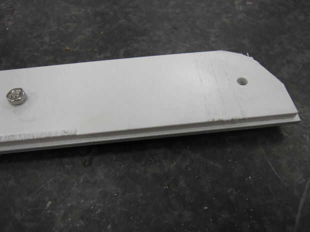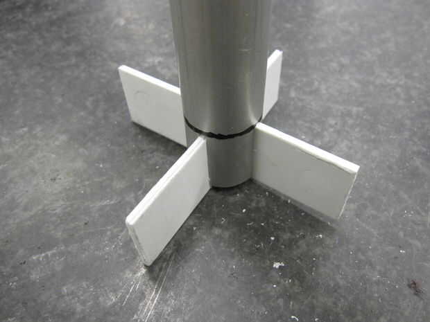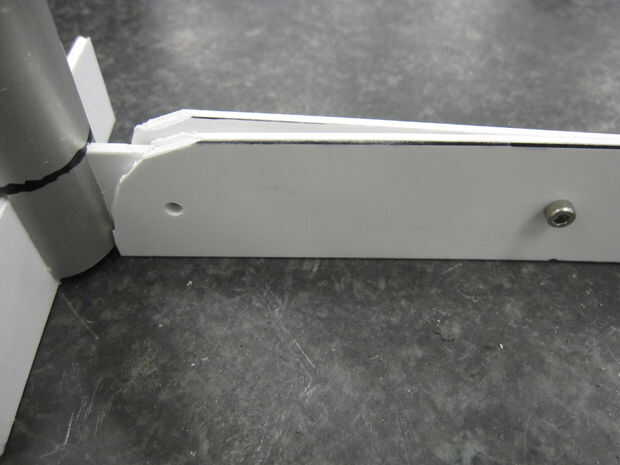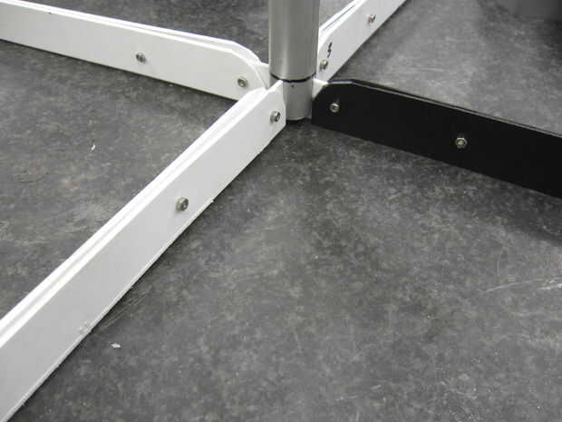Colocar las 8 piezas (pares) a cada una de las cuatro esquinas de la pieza transversal que se une a la de aluminio del tubo (ver fotos para mayor claridad). Usé 1/8" tornillos de hexagonal, pero realmente debería funcionar cualquier perno o tornillo. El agujero en el lado del corte angular será para fijar las estacas.
