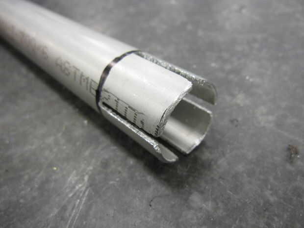 En el lado de los orificios perforados más de cerca, corte una esquina redondeada (esto permitirá que las "patas" a doblar hacia arriba hacia la pipa de aluminio).