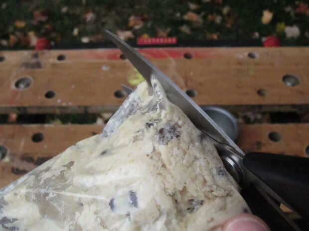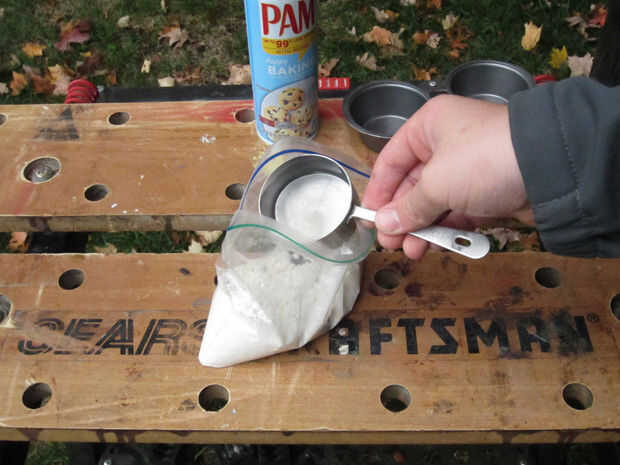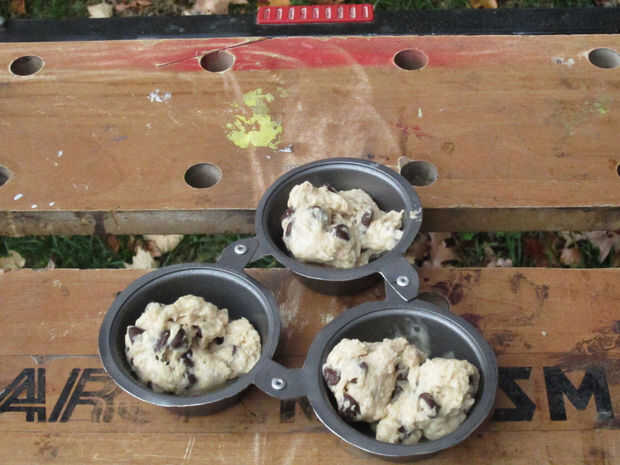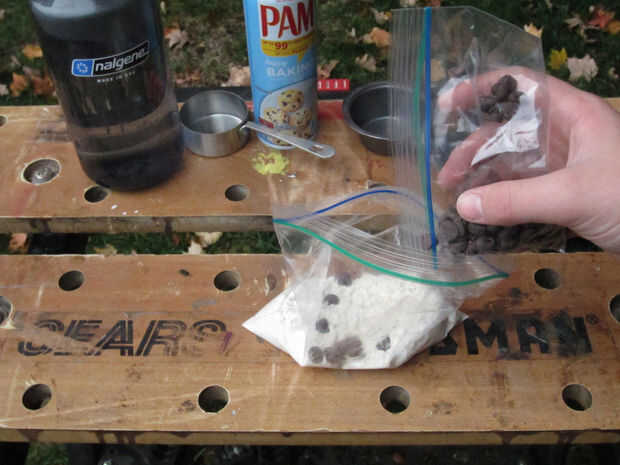 En el campo: Vierta los Chips de Chocolate en la bolsa completa mezcla de panqueque. Vierta 1/3 de taza de agua en la bolsa. Tenga cuidado de no agregar demasiada agua! Mezclar con las manos hasta que la masa se mezcla completamente y hay no hay grupos de mezcla seca presente. Ligeramente de aceite o mantequilla latas del mollete. Cortar la parte inferior del bolso y exprima la mezcla a - agregar partes iguales a cada taza muffin.