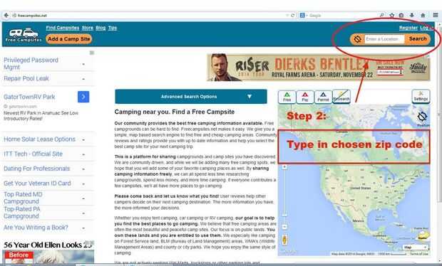 - Una vez que la página se carga, en la parte superior, a la derecha esquina hay un "Escriba una ubicación--barra de búsqueda". Allí teclea en su deseado código postal de donde quieres acampar