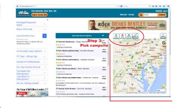 - Verde, rojas y azules de las tiendas repartidas por el mapa a la derecha de la Página Web. Seleccione la ubicación del camping deseado de cuál es disponible.