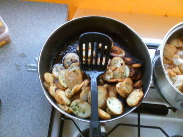 Estos fueron escurridos y cortadas antes de tirarlas en un sartén caliente con más ajo, sal y algunos secos hierbas. Una vez crujientes y marrón entonces se hacen.
