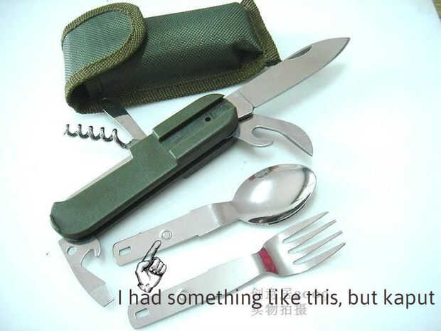 El fin de semana pasado fui a acampar, pero mientras tanto preparando mi equipo se da cuenta de que habían desaparecido misteriosamente mis cubiertos, ya era demasiado tarde para salir y comprar un nuevo cubiertos, así que fui rápidamente a la cocina a buscar algo aceptable, encontró que nada así tiene una cuchara grande y girar en un spoonfork.